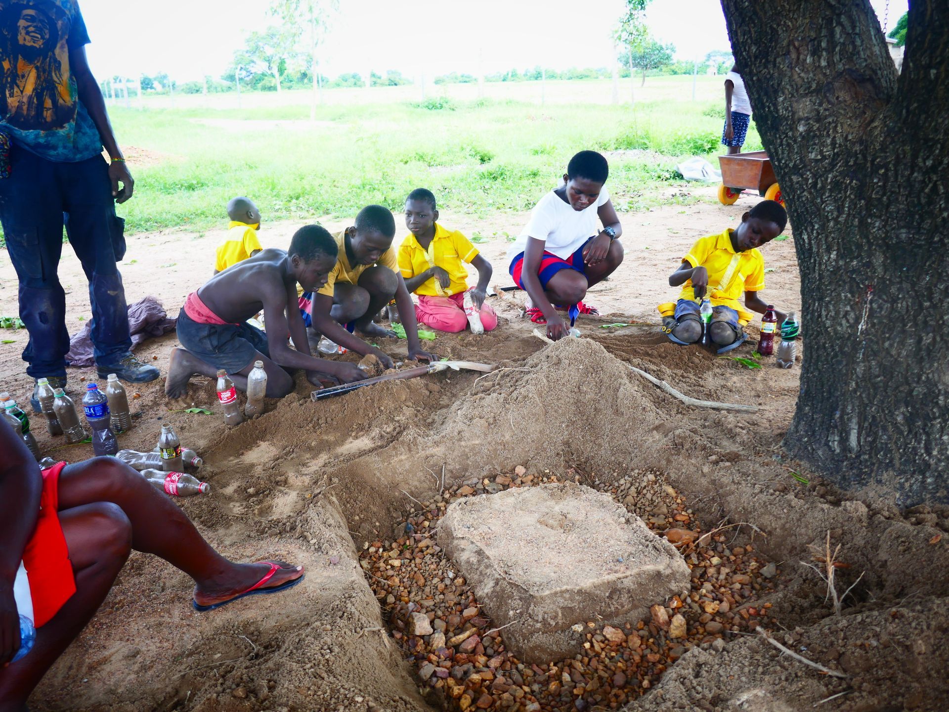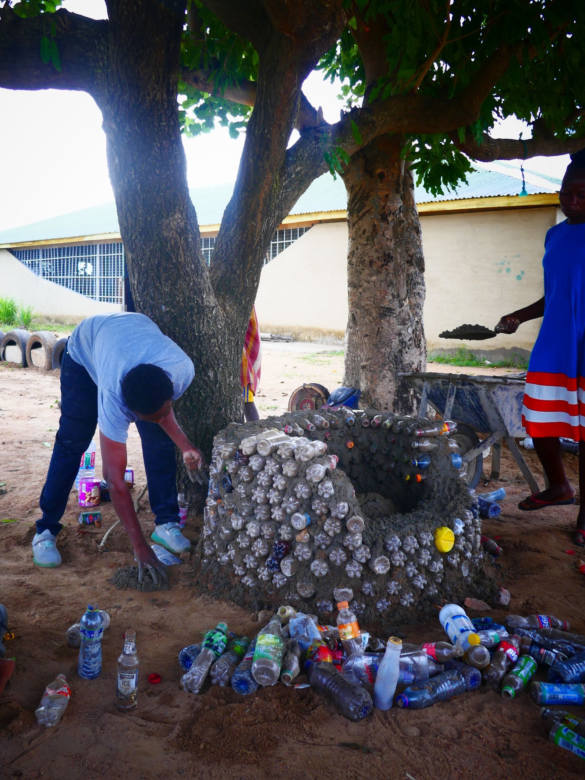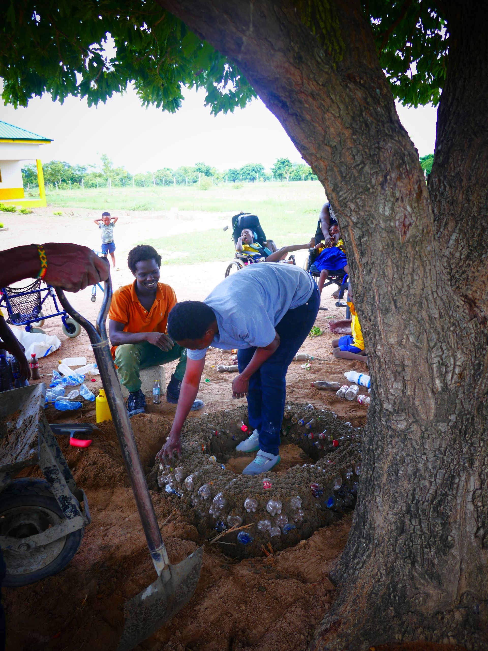 Onze workshopleider Sophia heeft de fundering gegraven en er kiezels ingelegd, met cement erop. Daarna was het tijd voor de eerste laag flessen die de basis vormden. De fundering wordt afgedekt met cement, als de hoogte is bereikt om met de stoel te beginnen, nadat de hoogte van de fundering is bereikt.