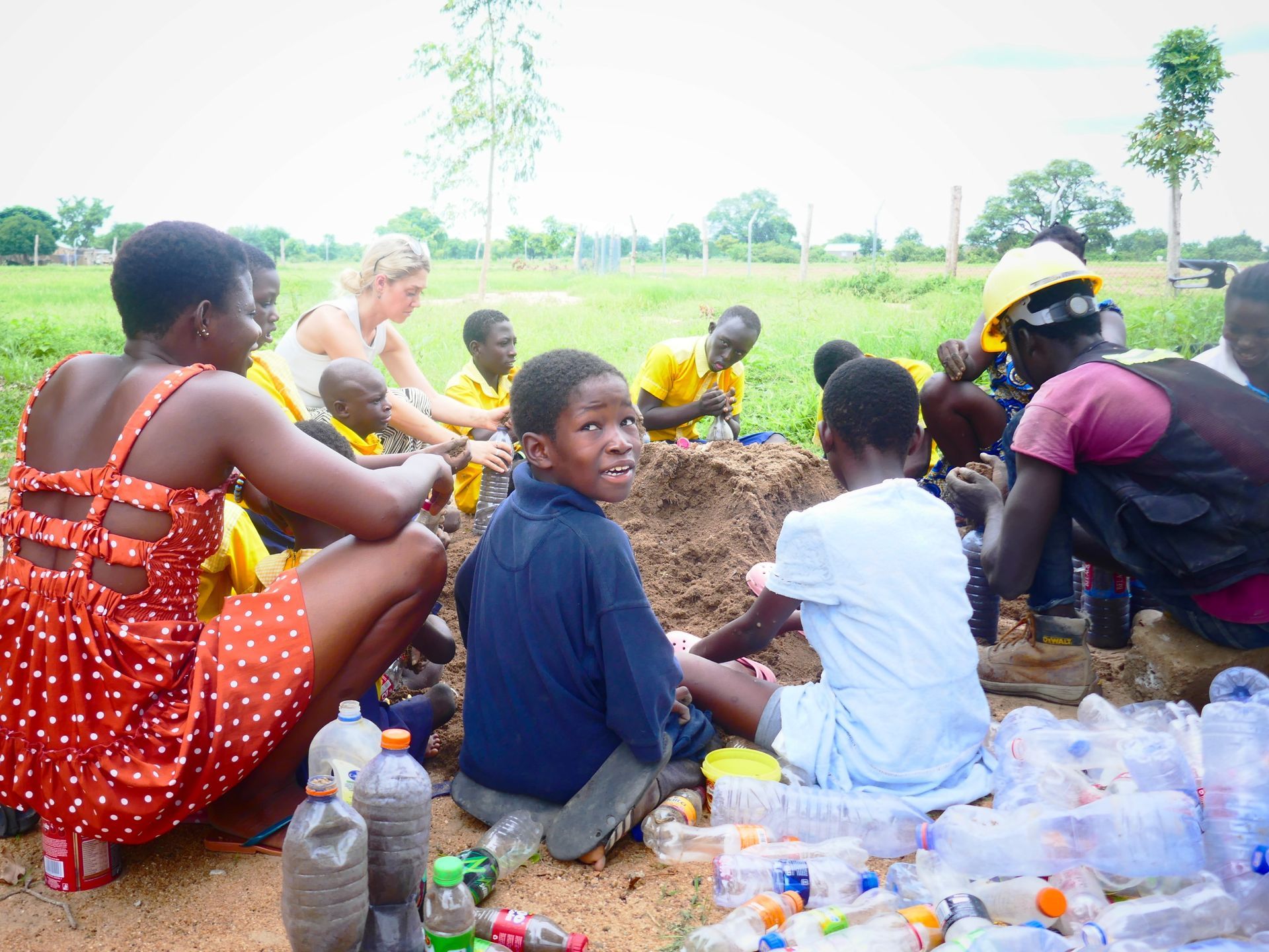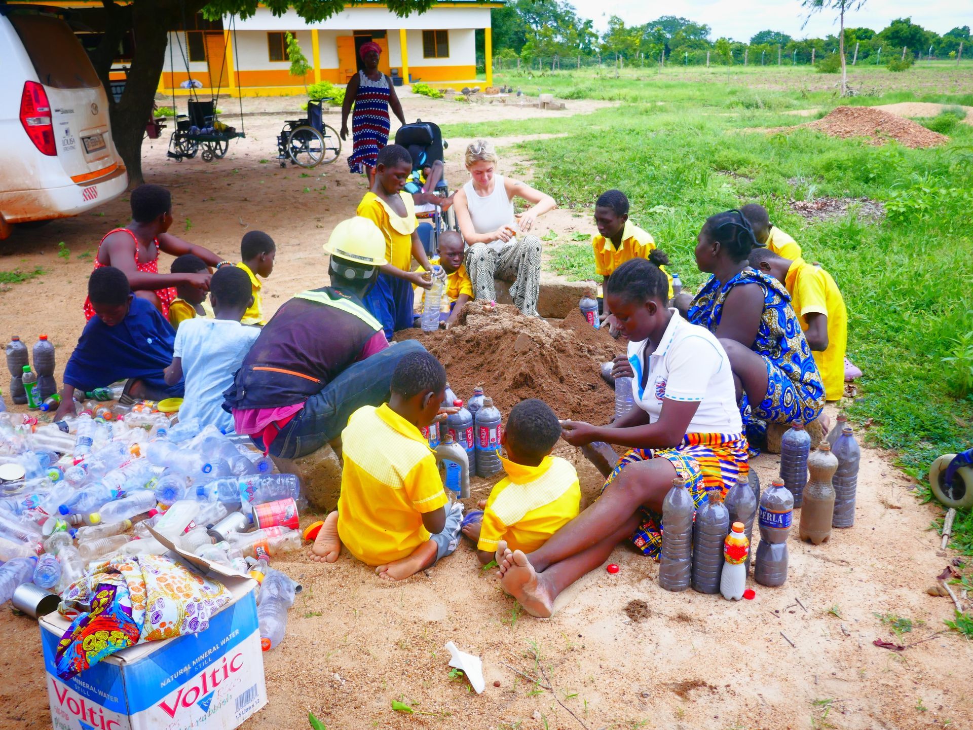 Toen ze terug waren op de Lumen Mundi School, vulden we allemaal samen (kinderen, personeel van de school en personeel van de community-based workshop) de flessen, blikjes en alles wat zand kan bevatten.