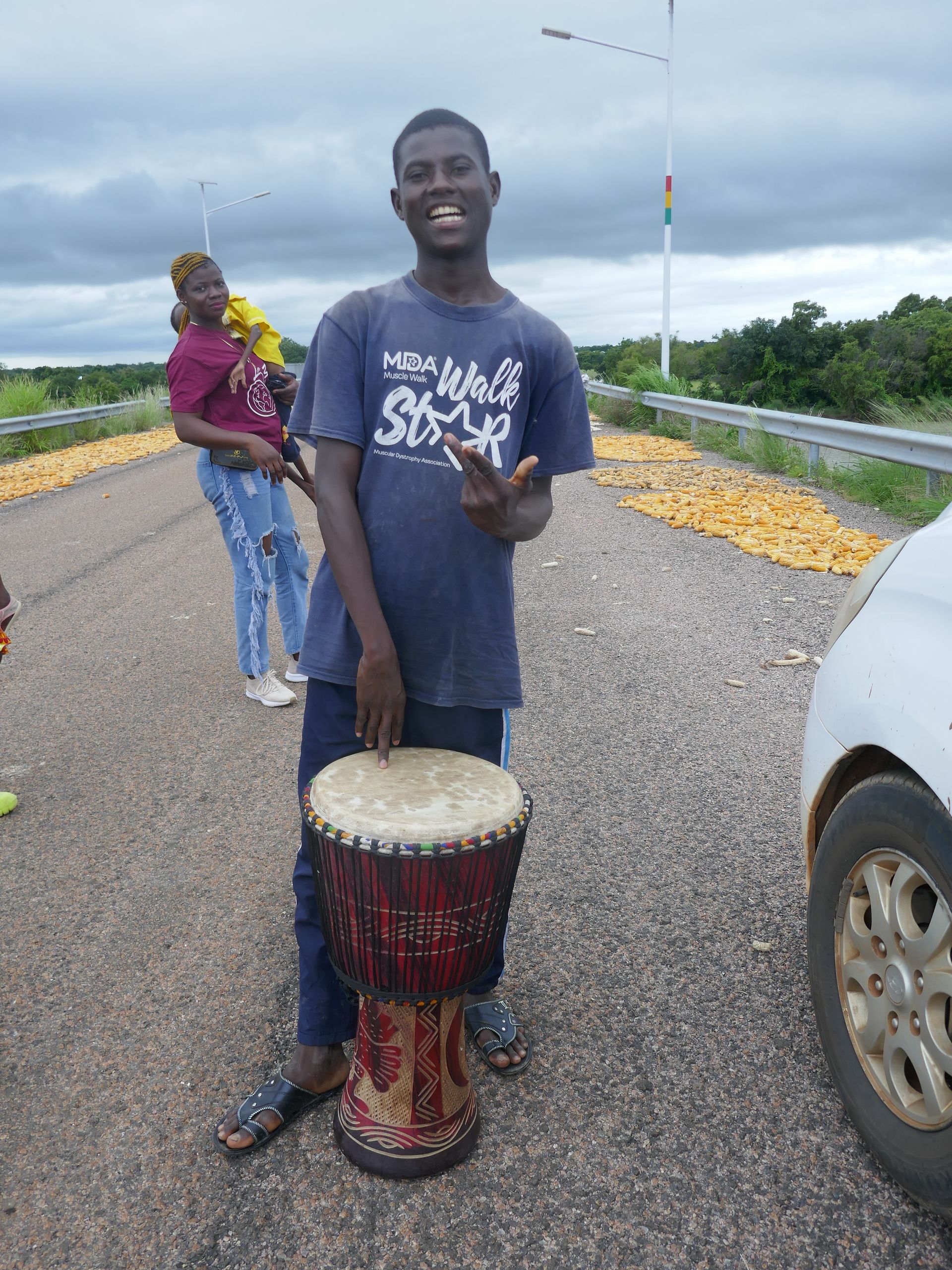 Met z'n allen in de bus (inclusief het personeel en de naaisters) en twee trommels begon de reis. Godfred speelde op de trommel en de rest zong! Dat was al een groot, groot feest! Onderweg vroeg ik of ze wisten waar we heen gingen. Ezekiel antwoordde: 'Ja, om veel water te zien!' En inderdaad, dat hebben we gezien!