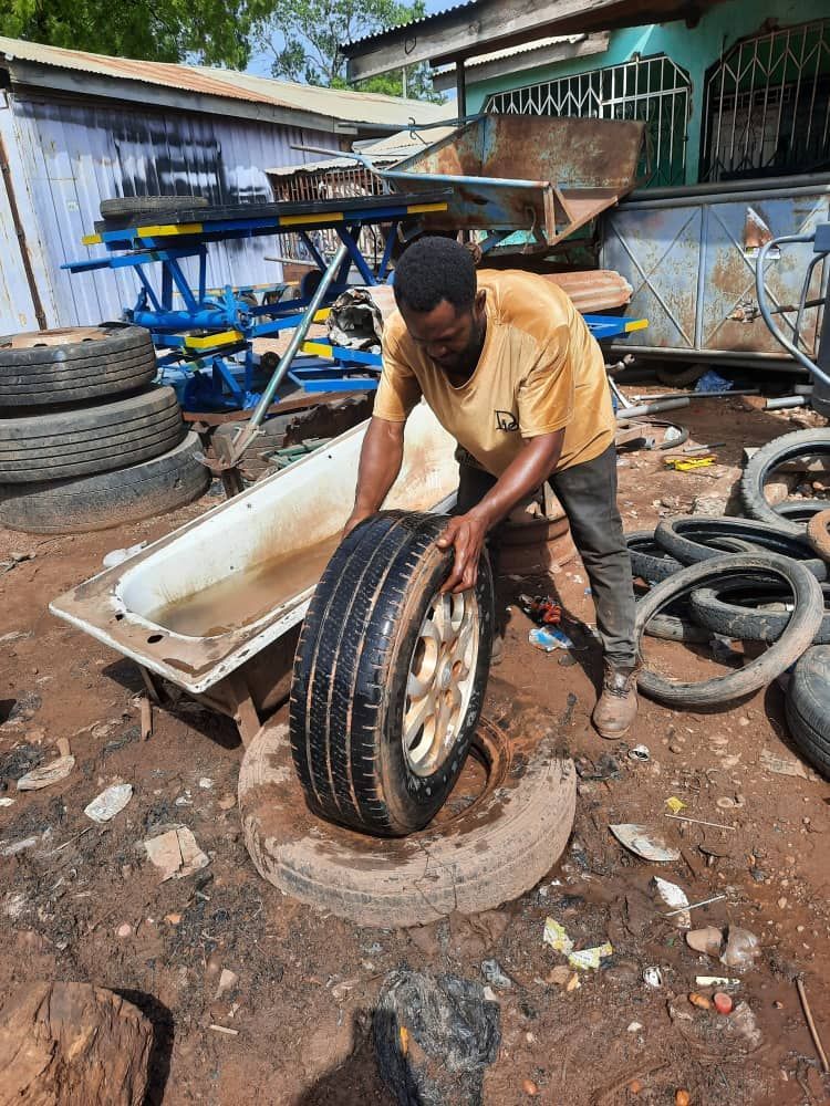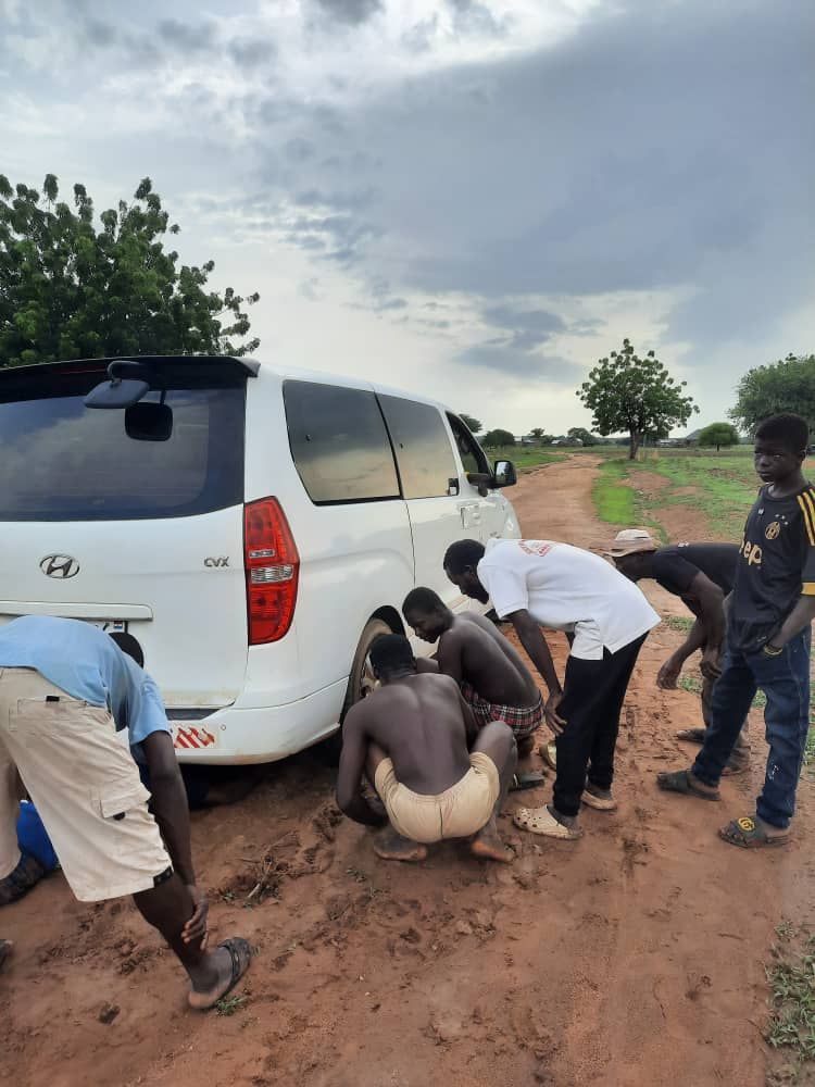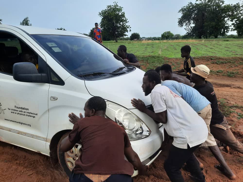 Gelukkig leef ik dan in Ghana. Binnen 5 seconden kwamen de omwonenden al helpen. Zelfs de vader van Lois kwam helpen. Wat op zich heel grappig was, want die ziet ons staan, brengt zijn moeder en Lois naar het ophaalpunt (links af) en vervolgens komt hij met zijn 2 andere kinderen weer langs zijn huis om ons te helpen!