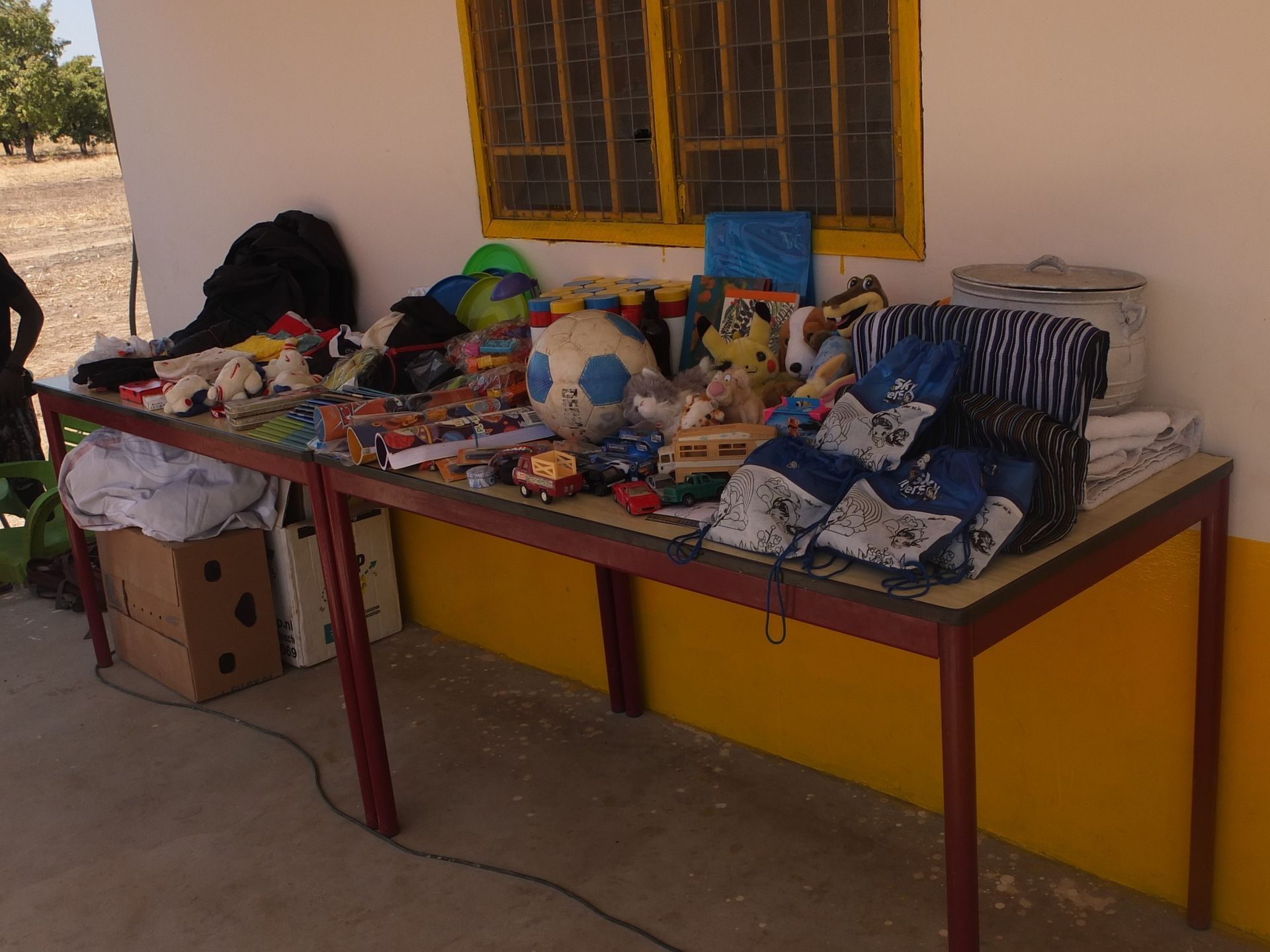 Ondertussen waren de kinderen binnen. Zij speelden en oefenden voor hun toneelstuk. Na alle toespraken was het tijd voor een loterij. Ezekiel, Junior, Ria en Margreet verkochten lootjes. We hadden een tafel met prachtige prijzen. We hebben veel lootjes verkocht.