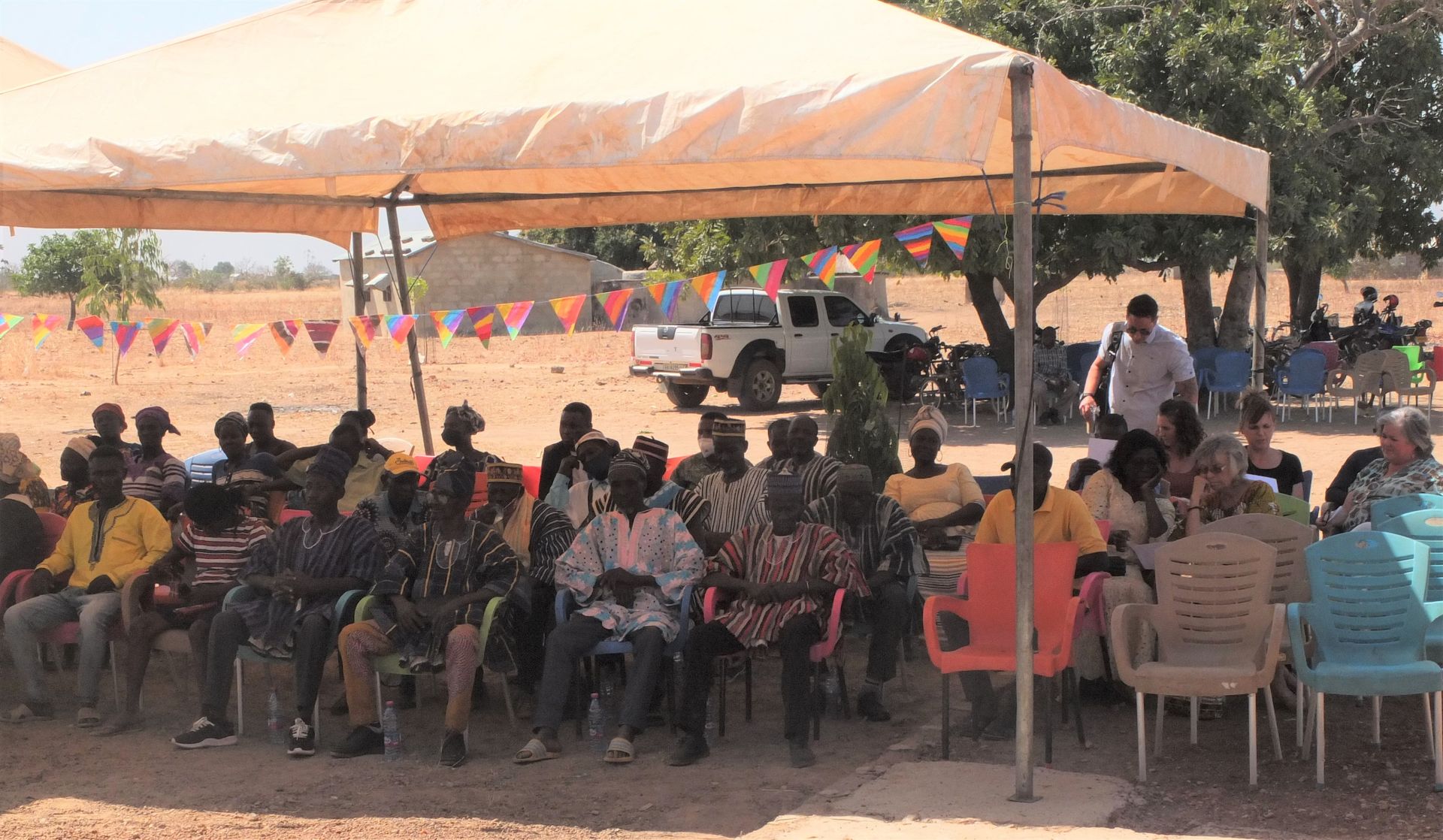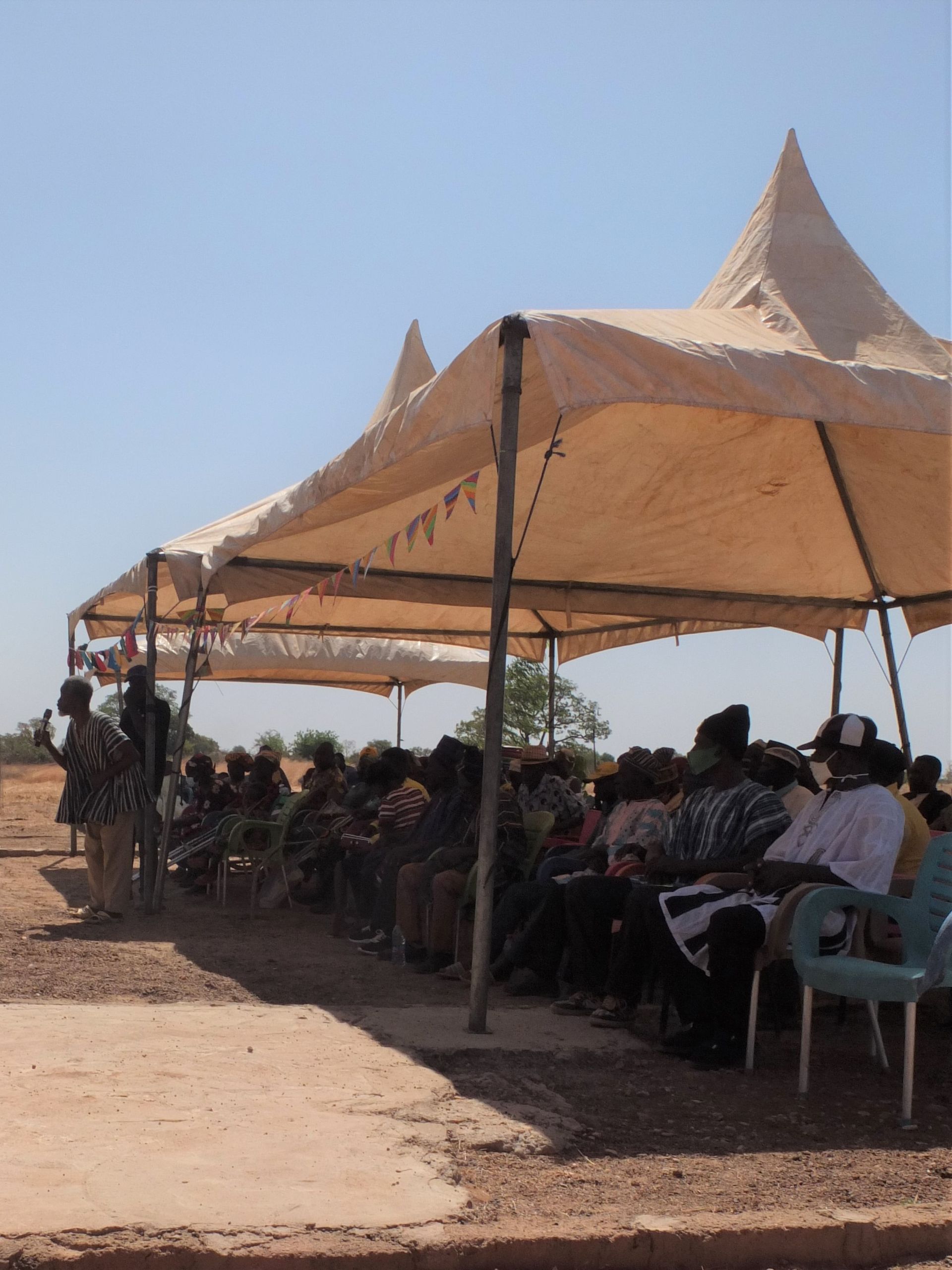 Zoals de gewoonte is in Ghana begon de dag met toespraken van alle mensen die aan de hoge tafel zaten. We hoorden mooie woorden! Bedankt voor deze mooie woorden! En daarnaast kregen we ook heel mooie donaties! Onder andere een schaap van de Paramount Chief, parelhoenders van de Dames van de Zijden draad, een geit van Mr. Amoak, die ons ook het land geschonken heeft, en veel geldbedragen van vrienden en kennissen! Het was een heel grote verrassing!