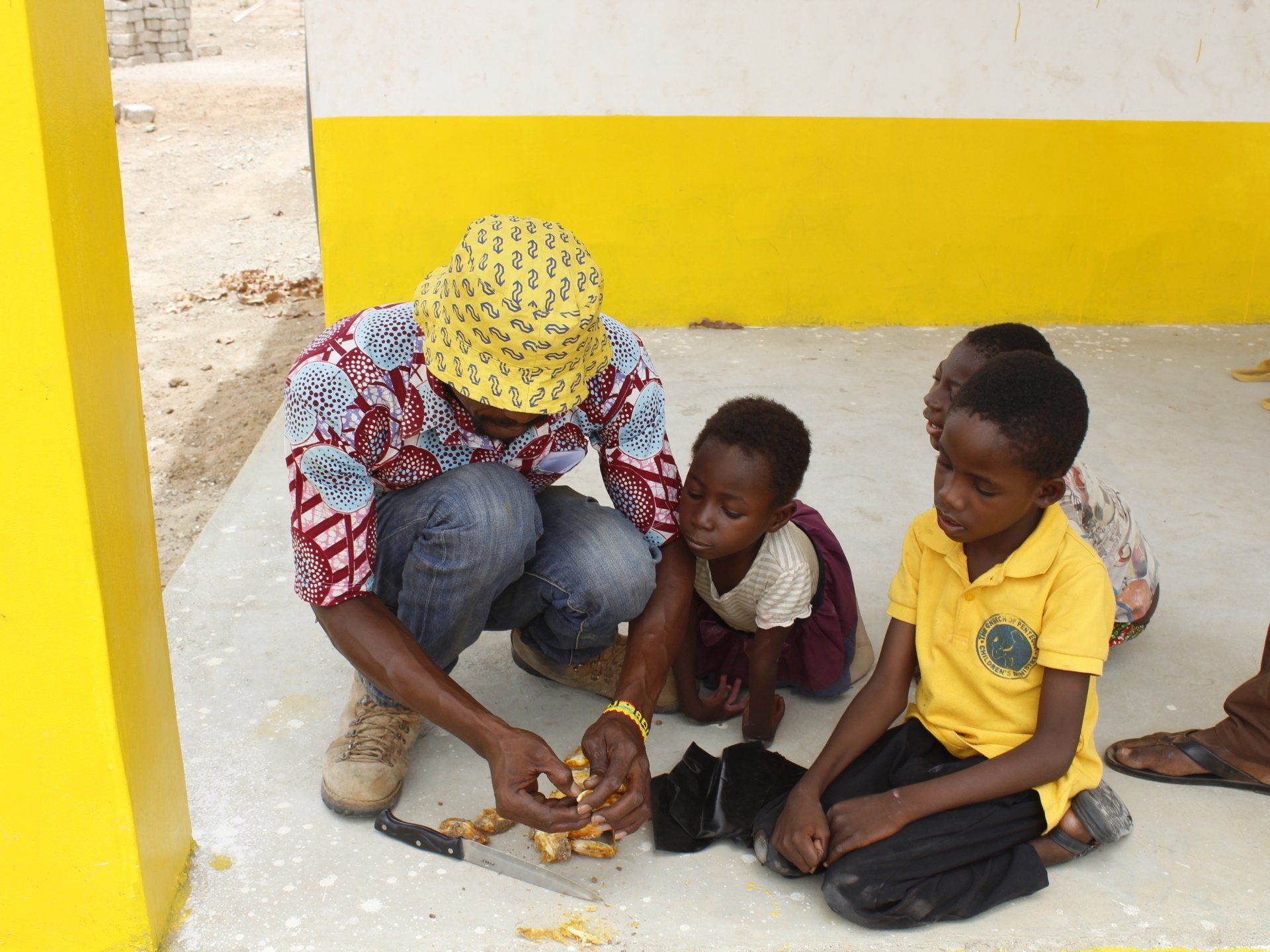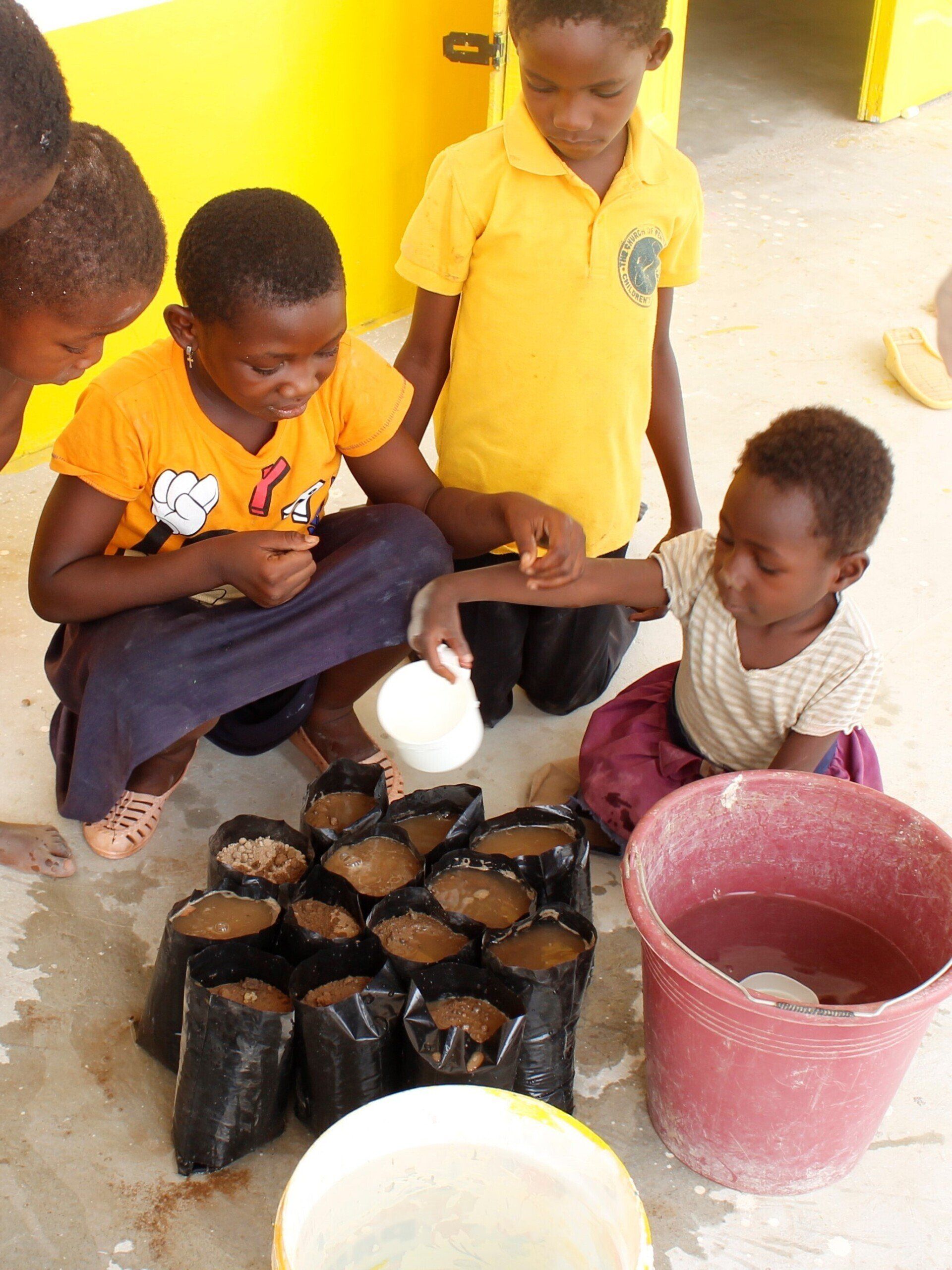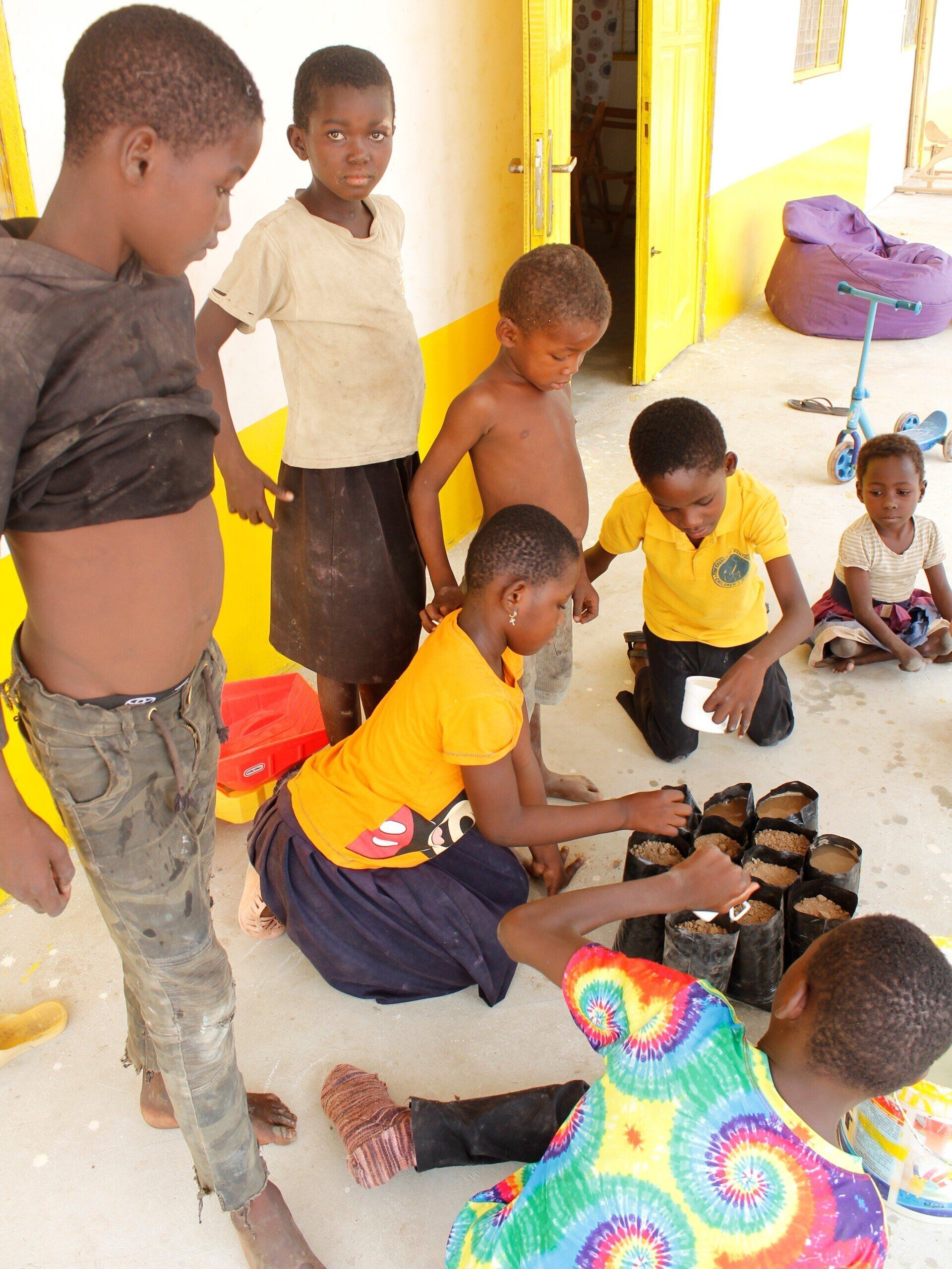 Wat een genot om te zien. Richard kwam even kijken in Siniensi en zag veel mango pitten op de grond liggen. Hij wil proberen om ze te planten en zo geld te verdienen, door ze te verkopen als ze zijn uitgelopen.