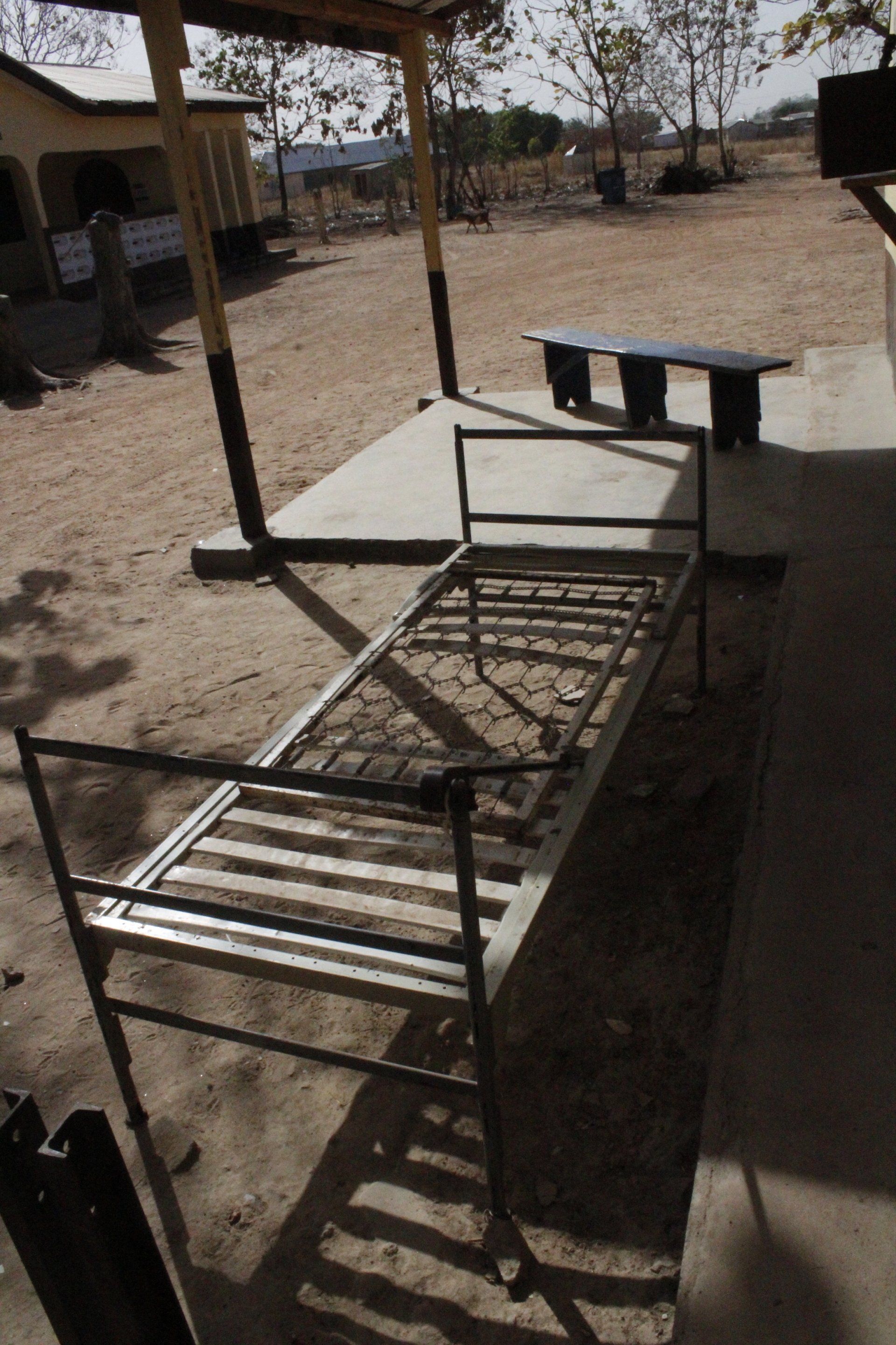 When the last one was transported, Kojo, Richard and I drove behind the pick-up to Siniensi clinic. Chief had been waiting there for a long time. The old beds were outside (see photo). When you see it, you understand Chief's reaction. I would almost say: what a poverty! In Siniensi the director of Presby Health Service (Bolgatanga) was present. He asked me for a list of the donated items. I didn't have one, so I made it there on the spot. But yes, my knowledge of laboratory materials is completely absent. One of the items now has the name: glass stuff... Many photos were taken. Especially from Chief trying out a bed! Richard showed the nurses how to assemble the beds. Each ward now has 3 beds. That's all that fits in a room.