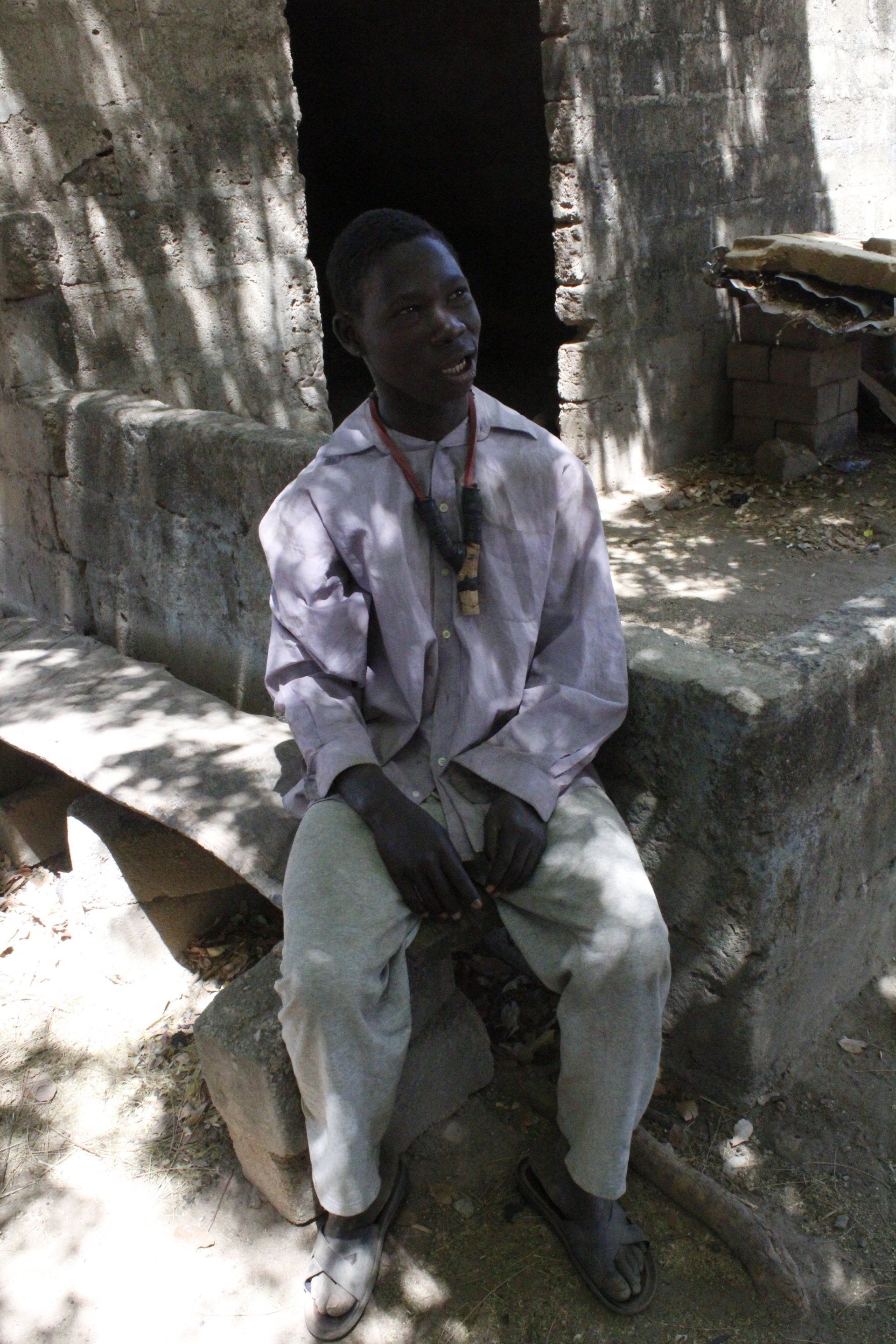 Zo waren we op zoek naar Ben. De vader hadden we al ontmoet, moeder was niet thuis, en Ben houdt van rondwandelen door Sandema. Er werd ond verteld dat hij vaak te vinden is bij een motormonteur. Wij daar via bovenstaande paadjes naar toe. Geen ben. Maar volg me maar zei één van de monteurs, ‘Ik zag hem net daarheen lopen!’ En daar ga je dan: hobbeldebobbel in een slakkengang dwars door een compound, met hoekjes en gaatjes. Dit werd zelfs Richard te veel. We zijn een dag later teruggegaan en hebben ben gevonden: inderdaad bij de motormonteurs, met een prachtkatapult om zijn nek!