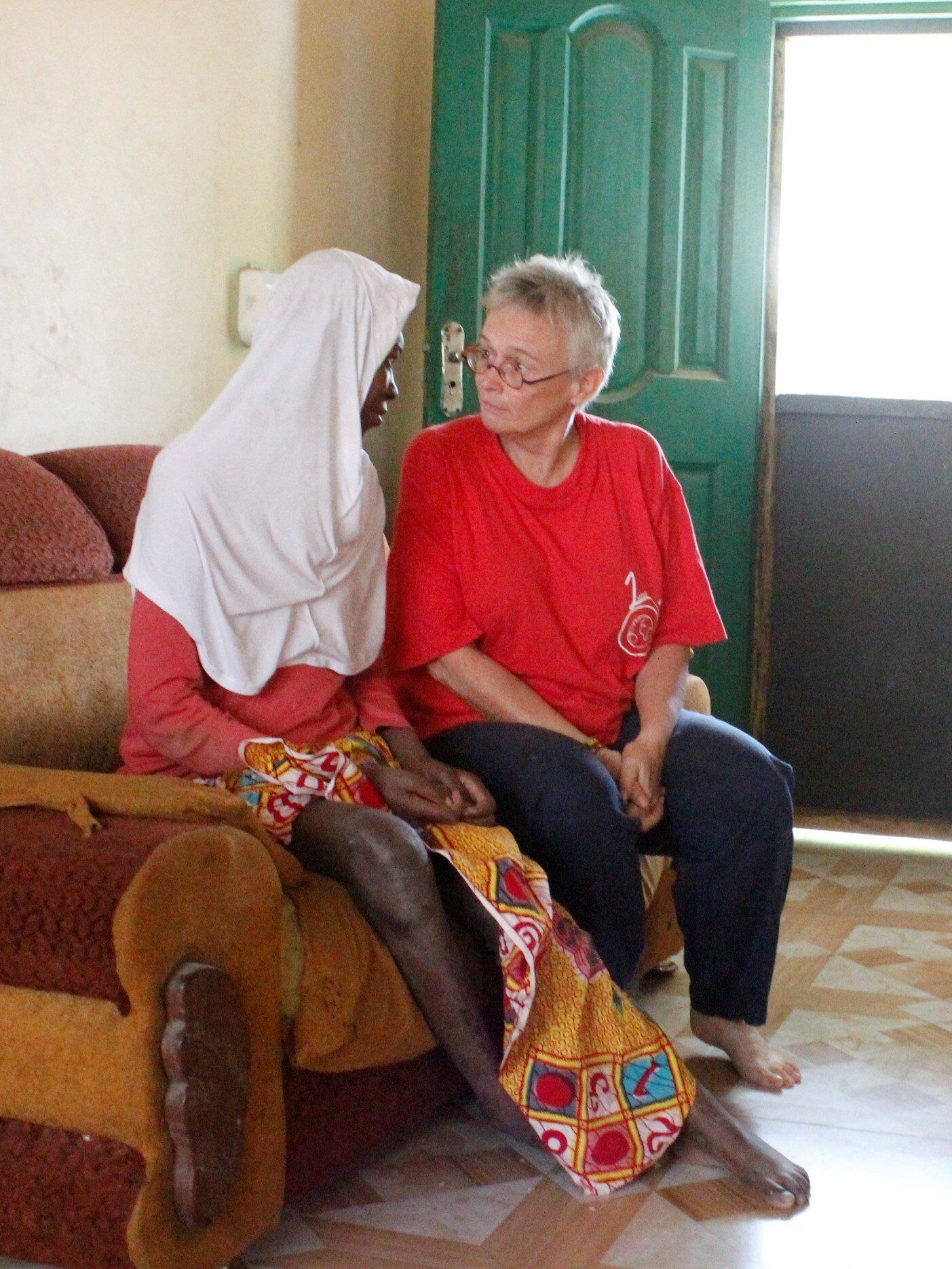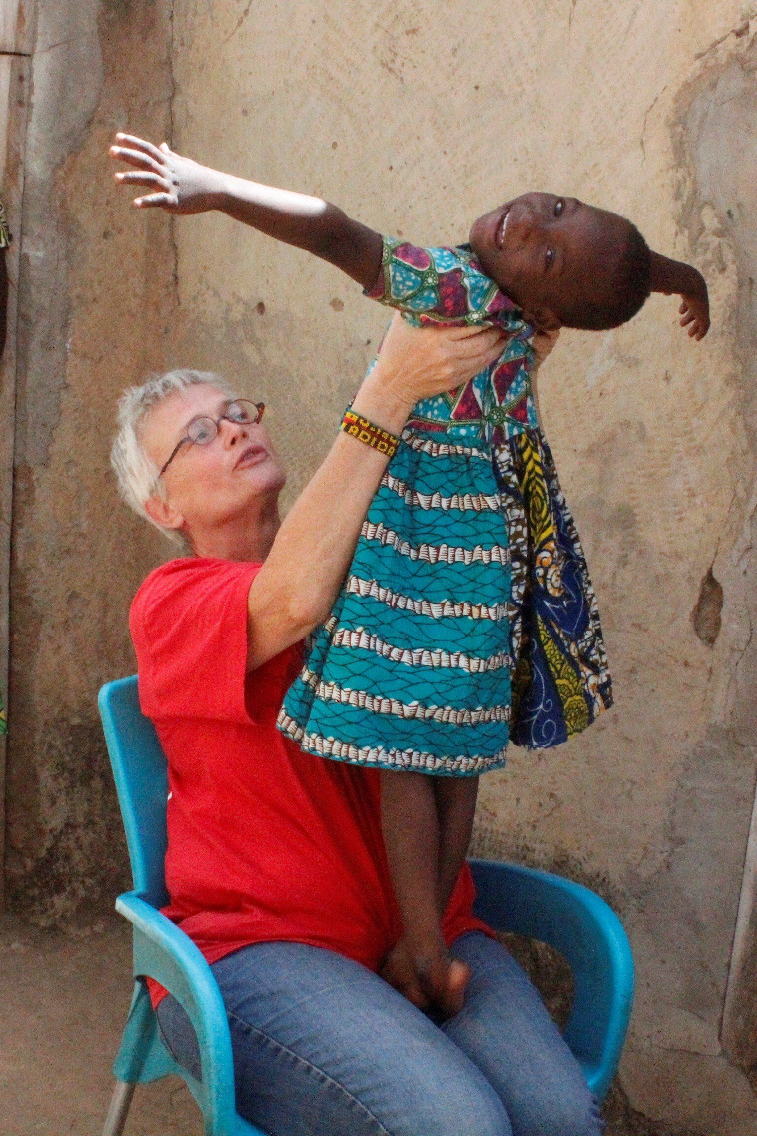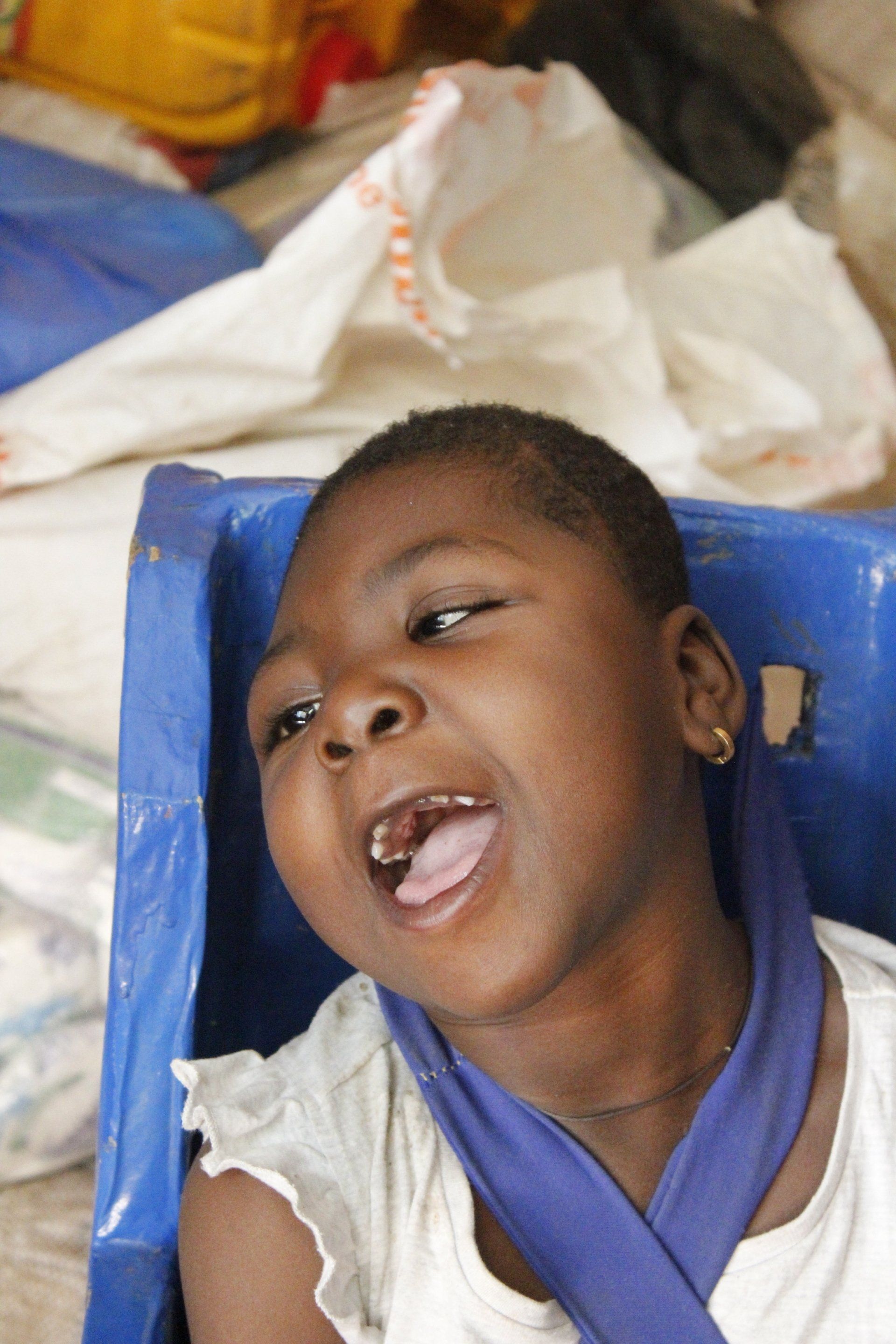 We were let into the compound. (Of course) I got the only seat (Of course). We talked with Richard as translator. Conclusion: she can't stand or sit properly. Has occasional spasms. You can leave her alone if you are doing something nearby. We will have to look for a doctor who will see if it is possible for her to learn to sit independently and, even better, to stand. And especially a speech therapist. But to be honest, I wonder if there is a speech therapy course here in Ghana!