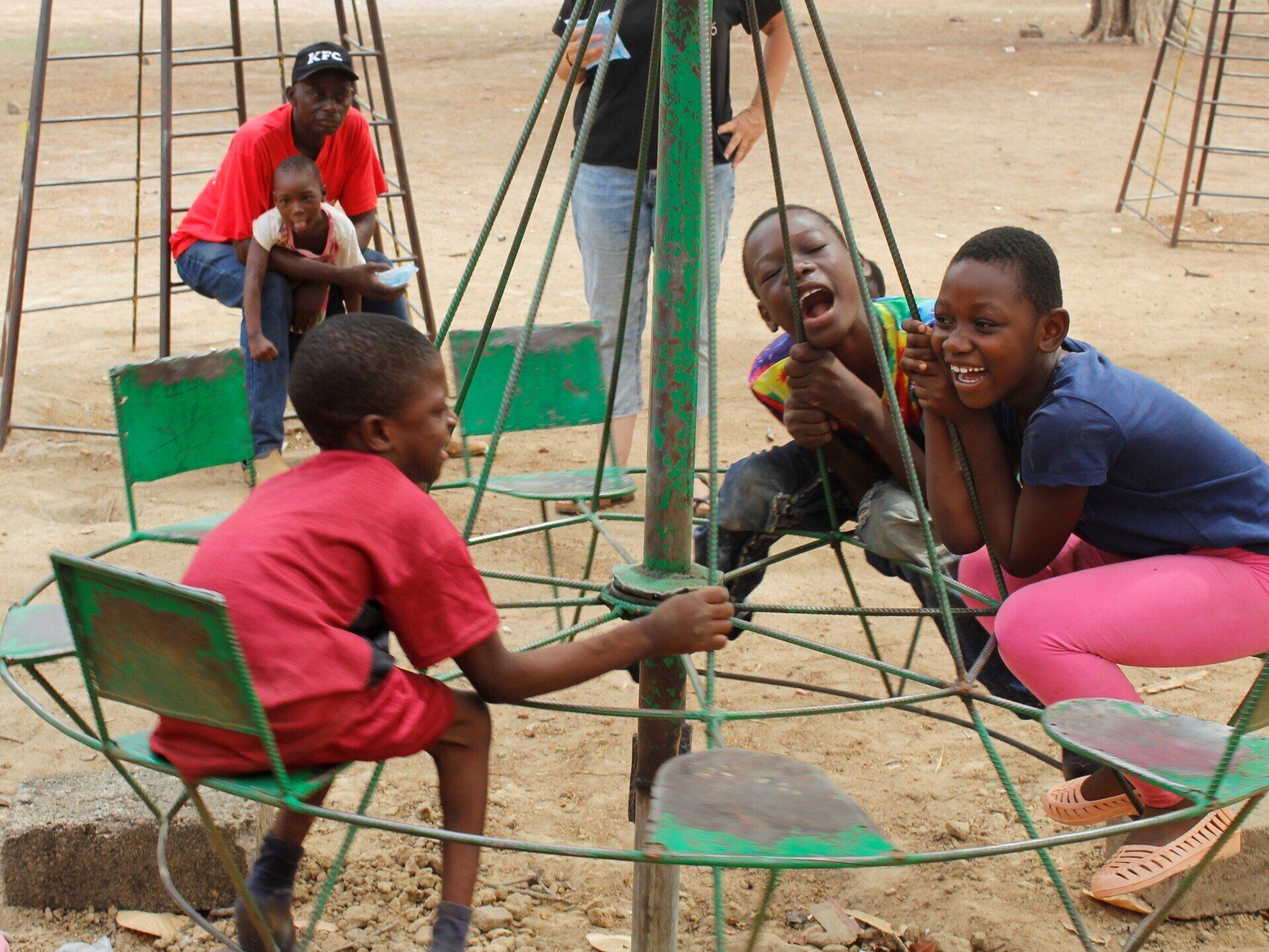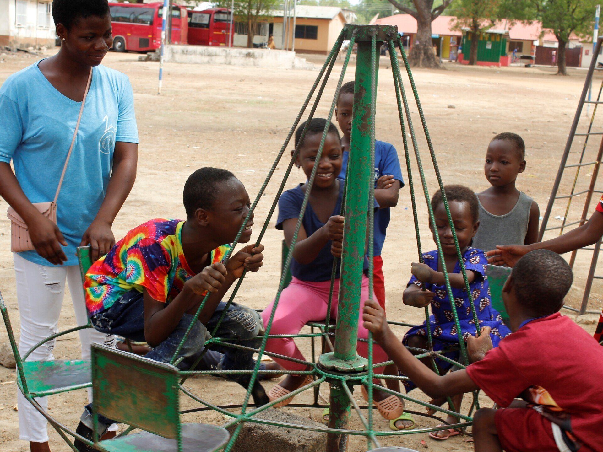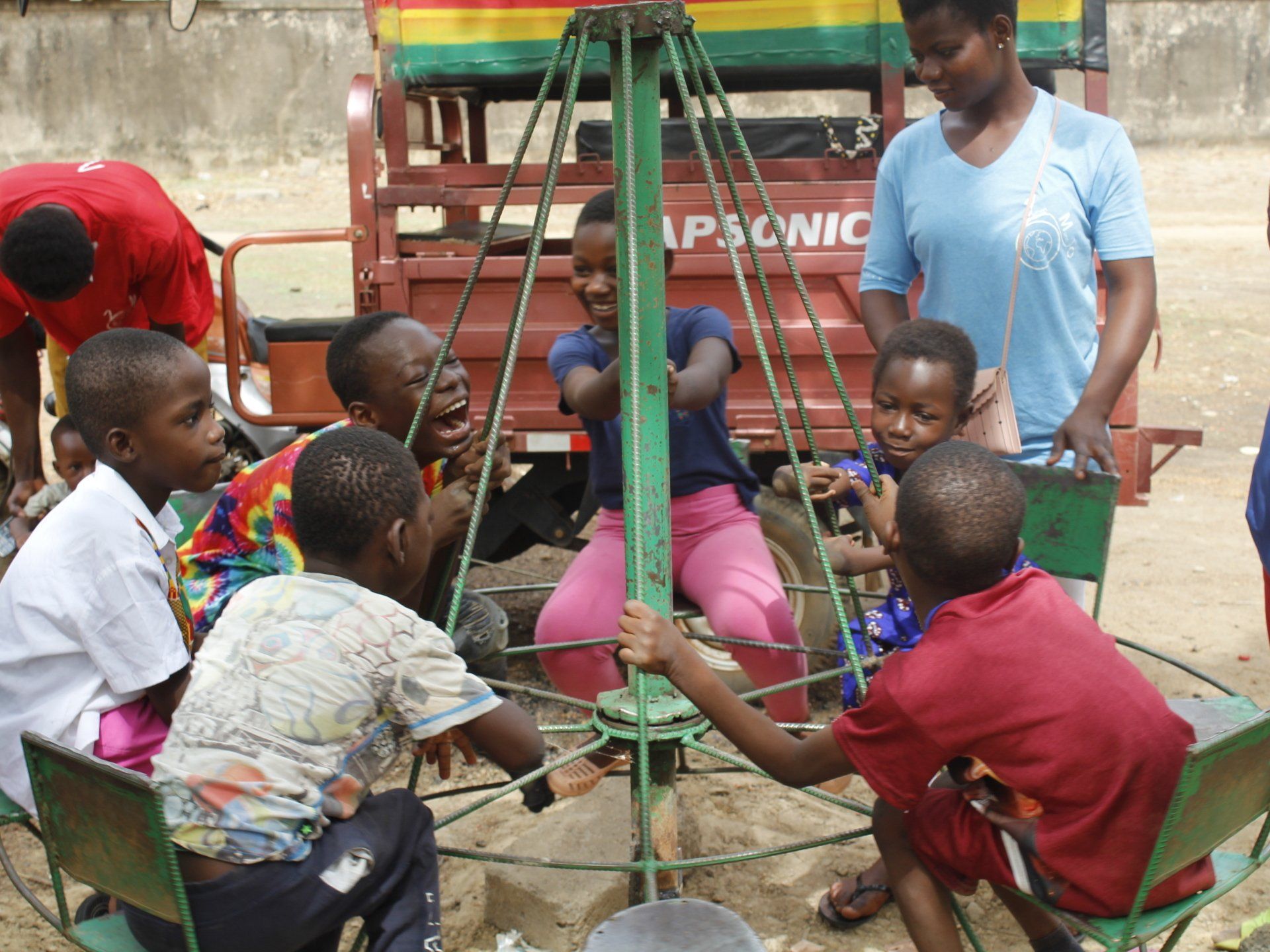 Unfortunately, the chairman and the regional chair9wo)man were not yet present. Now the building is near a kindergarten, where Louise and I, when we were both VSO (Volunteer Services Overseas) volunteers, built a playground. We found the climbing equipment, a merry-go-round and 3 slides neatly stored in a small room... Louise has invested some money and Kojo (who now works for Lumen Mundi) has installed the playground equipment. And we have now gratefully made use of it!