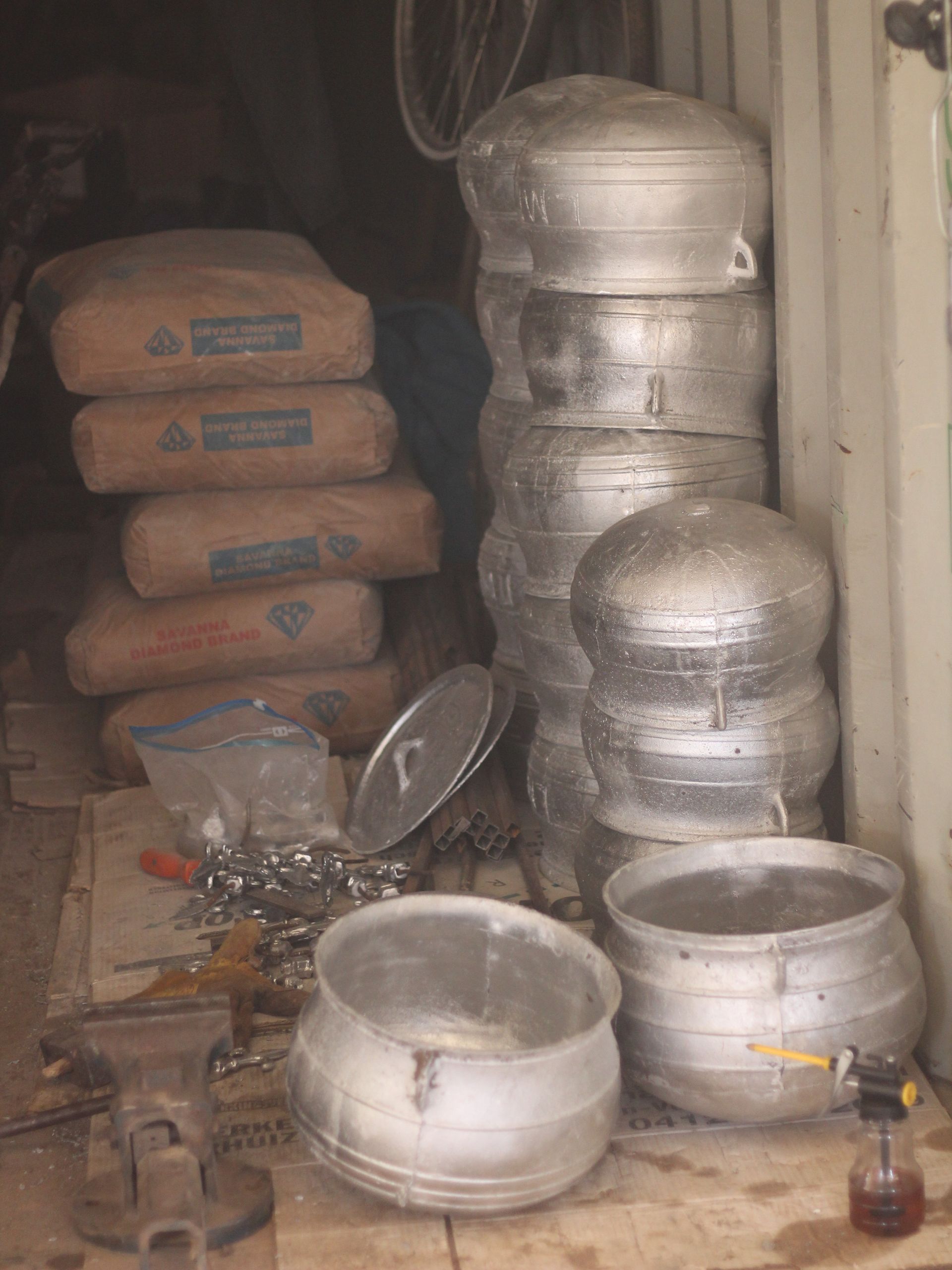 Er wordt gewerkt aan het ontwerp van een regenjas voor kinderen (op de foto showt de zoon van Richard Asumbisa het eerste prototype) en aan een zwemvest. Paul, een selfmade student van 28 met een fysieke beperking, liet ons zien dat een jongen in het zuiden vond dat de omgeving van zijn school zo vies was. Deze jongen maakte van waterzakjes grote afvalemmers (foto). Dat is voor ons zeker ook een idee!